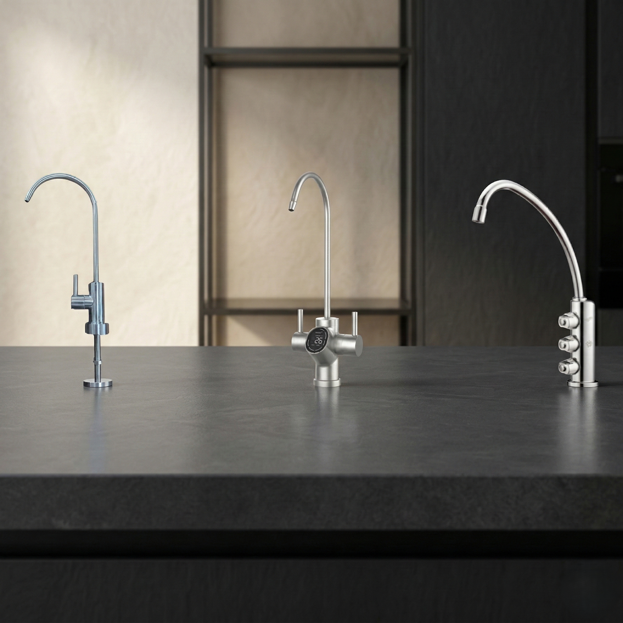 Minimal, discreto, separato. Un secondo rubinetto installato vicino al principale, dedicato esclusivamente all’acqua purificata. Disponibile ad una via, 2 vie e 3 vie.